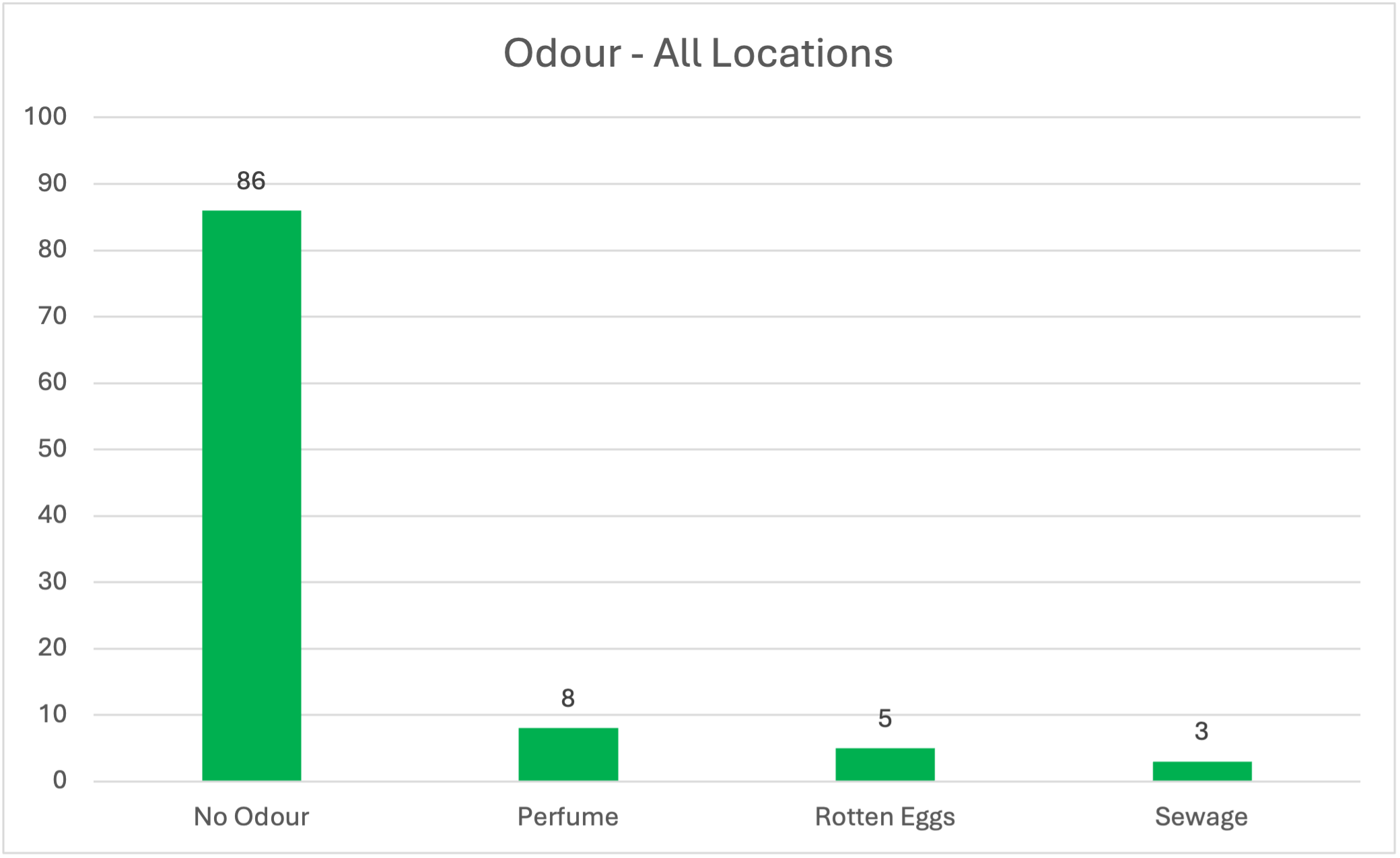 During the monitoring week, 84% of all observations recorded no odour. The small number of odours detected included perfume (8%), rotten eggs (5%), and sewage (3%). These results confirm that landfill odours were very limited and that the majority of odour observations remain unrelated to landfill activity.