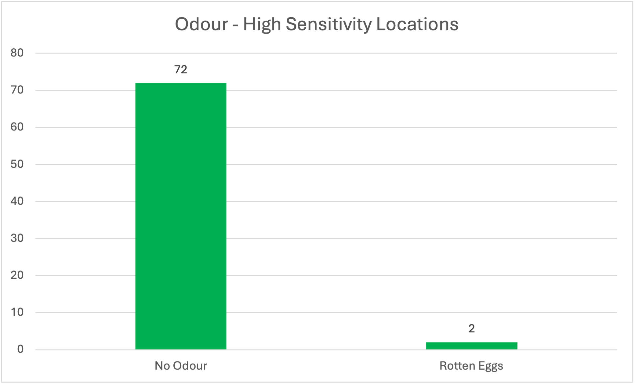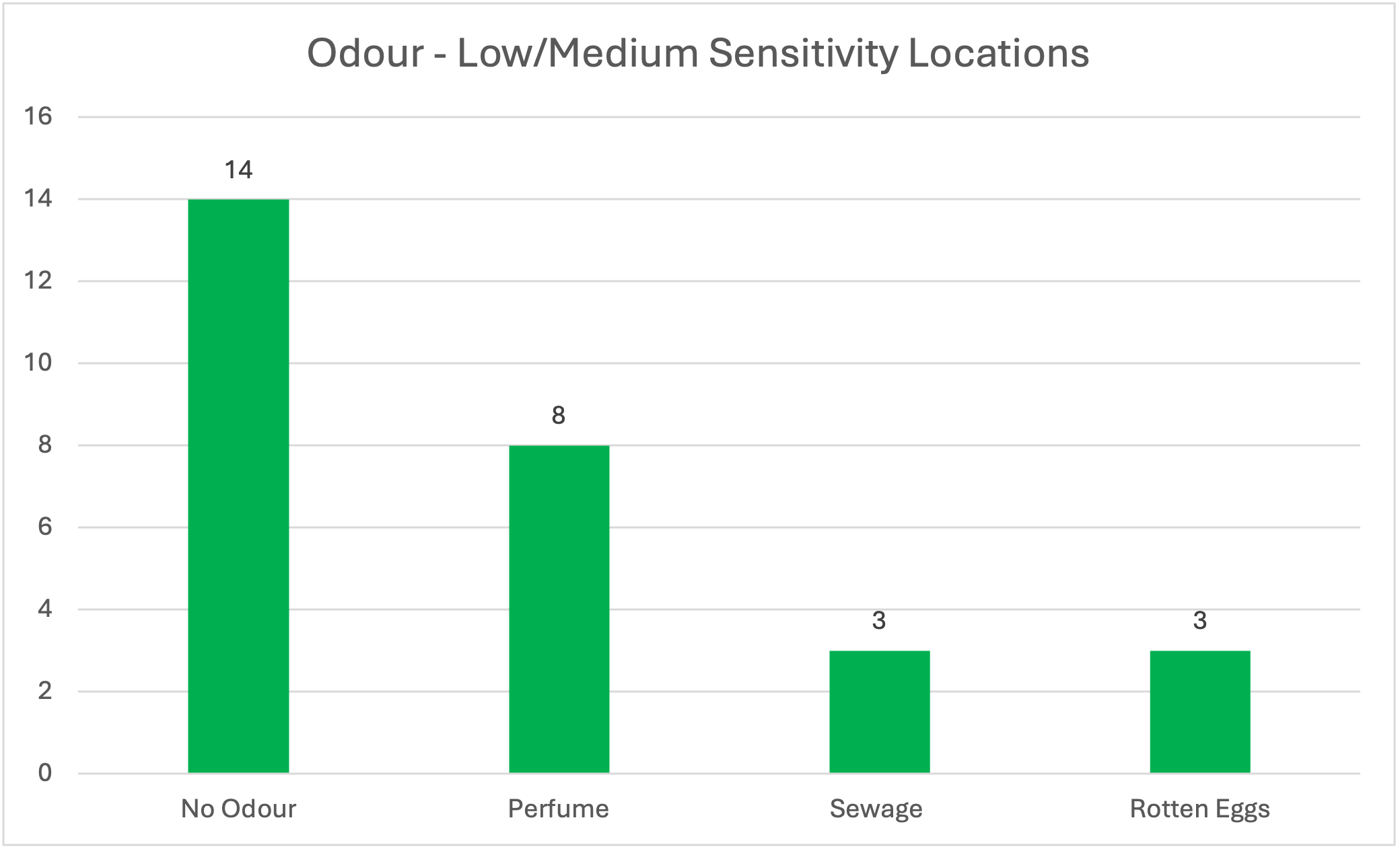 In lower and medium sensitivity areas, odours were more varied but still generally non-landfill in origin. 50% of reports recorded no odour, while the remainder included perfume (29%), sewage (11%), and rotten eggs (11%). This suggests that industrial and wastewater-related odours were more noticeable than landfill-related odours at these receptors.