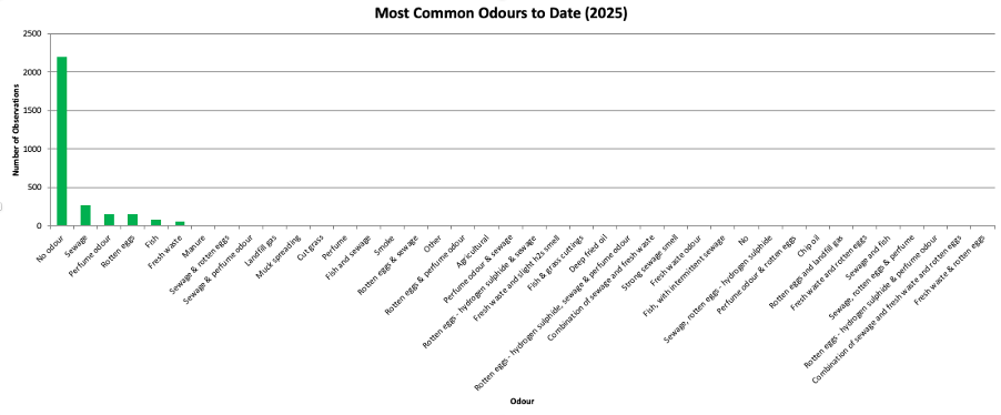 Since monitoring began in 2025, the most frequently recorded outcome remains “no odour”, representing 73% of all observations (2,199 out of 3,947). Among odours identified, the most common have been: